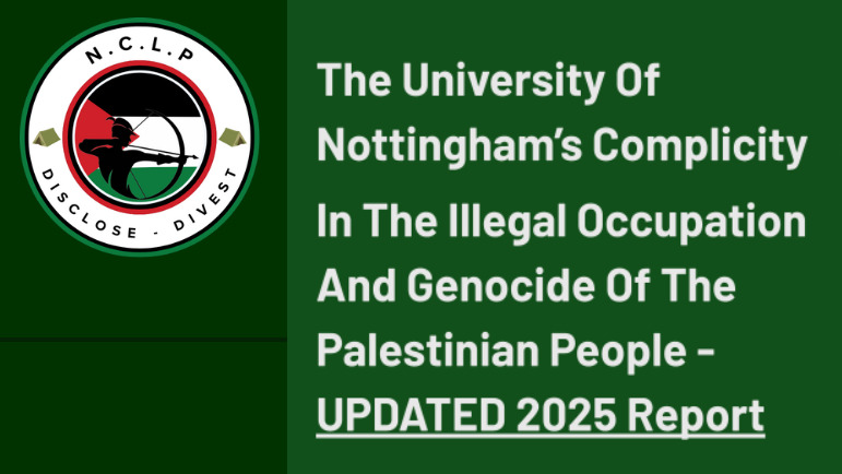 The University of Nottingham is complicit in the ongoing genocide in Palestine. The student group Nottingham Camp for the Liberation of Palestine (NCLP) has done impressive and extensive research on the University’s collaboration with arms manufacturers and Israeli institutions. You can download the full 81-page report by clicking the image below.